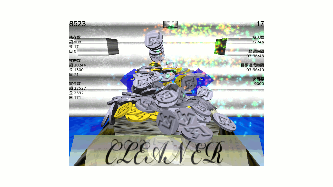 メダル落とし ゲーム紹介 2012年12月16日 ゲームセンターでよく見るあのメダル落としです。 少し違うところは(以下ゲームの説明) ・目標枚数になると上みたいに大量にコインが出てくる (目標をクリアすると目標数が500枚+クリアした目標数となる) ・アイテムがある ・コインには3種類あり銀を基準に 金・・・銀の5倍 白・・・金の5倍 のコイン数が追加される です。 少し分かりずらいのでここでまとめ ・使えるコイン数・・・・・左上の数字(このスクリーンショットでは8523) コインを入れることで1ずつ減っていく ・残存数・・・・・・・・・・・その名の通り ・賞与数・・・・・・・・・・・その色のコインをいれた数 ・アイテム効果時間・・アイテムの効果時間(ここでは17) 時間のほか一部のアイテムを除きコイン投入数×1ずつ減っていく ・投入数・・・・・・・・・・・コインをいれた数 ・経過時間・・・・・・・・・始めてからの時間 ・目標達成時間・・・・・目標達成から次のの目標の達成までの時間 ・次目標・・・・・・・・・・・次の目標枚数 金および白の発生条件 細い穴が左右にありそこに銀が入ることで金が、金が入ることで白が手に入る 小ネタ シフトキークリックかコントロールキーでコイン連続投下 あるキーと何かをしたりするなどでそれに対応したアイテムの効果を 強制発動(注 コイン消費有) あとは勘で頑張ってください http://www.unitygames.jp/game/ug4489001 [0回]